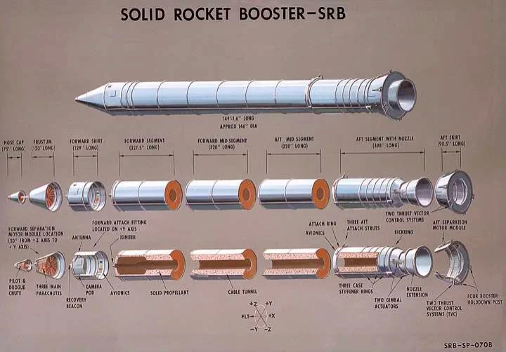 The SRB cases are segmented, made using a unique manufacturing method starting with an ingot of steel. The hot ingots are kneaded like a blob of dough. Imagine taking a blob of dough and poking your thumb in the middle of it. Roll it from the inside around and around until you push it out to a thin cylinder. Male and female joints are machined into each edge. That is how the SRB cases are made. Then several structural segments are bolted together with an O-ring seal between to make a casting segment. A casting segment is then filled with the solid propellant fuel in a thick cylinder. The fuel is mostly rubber and alumi-num powder with the consistency of automobile tire rubber.